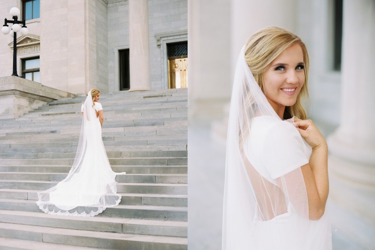 Jasa Connell Horne holds a single white flower in these lovely bridal portraits against the elegant backdrop of the Arkansas State Capitol. Her long trailing veil, silver earrings and unique bouquet take classic wedding elements and give them a simple, bold twist.