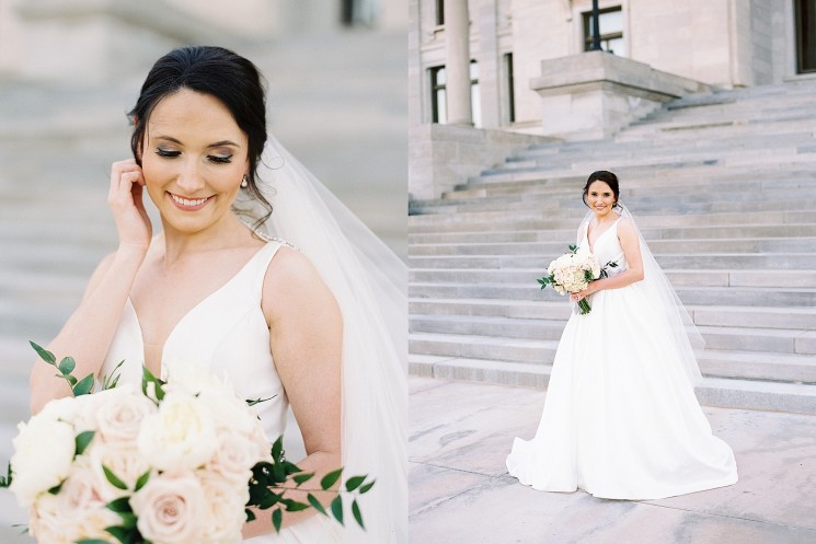 Kala Burgener took her bridal portraits among the steps and columns of the Arkansas State Capitol building. The white of her dress, flowers and the building made for a striking picture, but there’s just enough glam in her jewelry and dress detailing to make a statement.