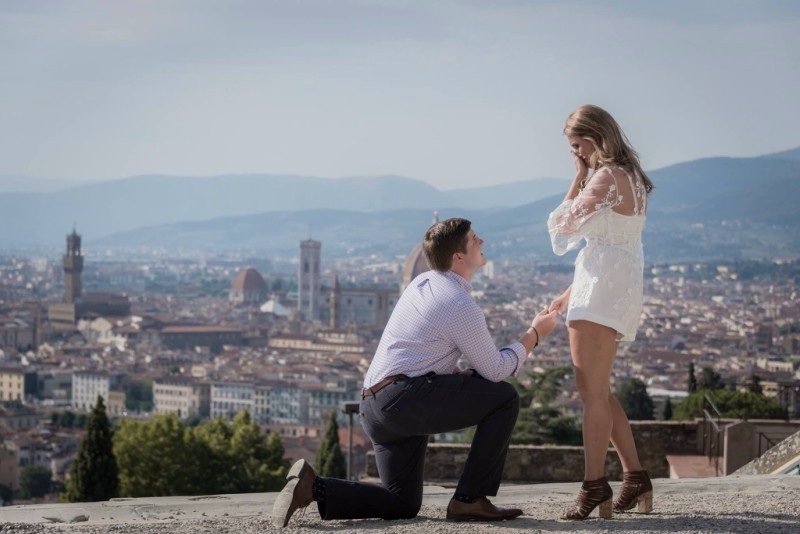 “Grant had planned to come visit me while I was here. I had no idea that he was planning to propose! On the day of the proposal I thought we were going to a very fancy dinner at the top of the Piazzale Michelangelo and then we were going to meet up with friends. When going to dinner Grant said he wanted to stop at the church on the way. We walked around a little bit and just as the church bell rang at 6:00 Grant got down on one knee and proposed. I never cry, but the tears of joy were running rampant! I was so shocked and the view was so romantic. Surreal is the only word I can think to describe it! Grant had also arranged for some of my friends to greet us after and a photographer was there to take pictures of us during the proposal and after. It was amazing. His proposal and the ring were beyond my wildest dreams.”