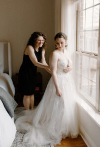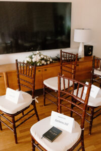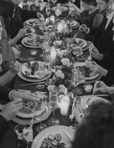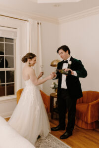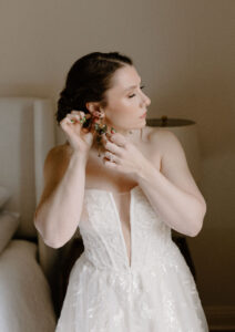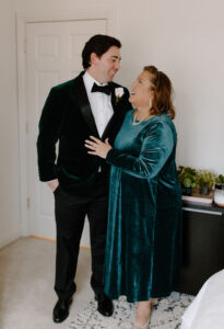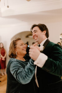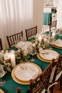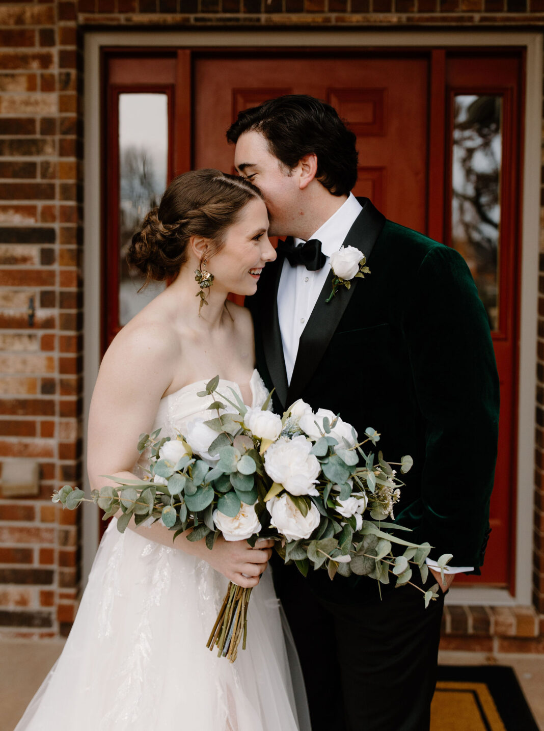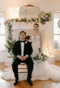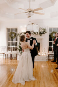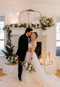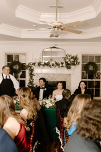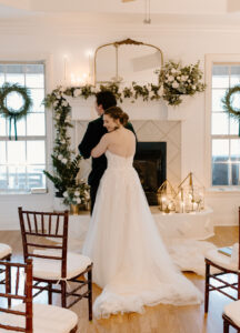 Mary Beth and Ethan exchanged vows in the cozy warmth of their home, surrounded by soft candlelight that flickered against winter windows. White, gold, and velvet green accents filled the space, creating an elegant and festive Christmas atmosphere. Evergreen garlands draped over the staircase, catching the glow of golden ornaments. Their closest loved ones gathered in intimate circles, sharing quiet joy as snow fell outside. Wrapped in the magic of the season, the newlyweds celebrated a love that felt as timeless as the holiday itself.
