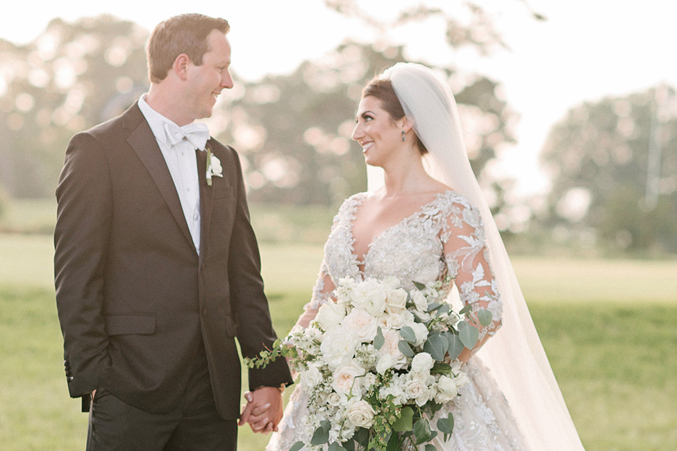 It’s hard to miss Tanarah Luxe Floral’s incredible arrangements spread throughout Katie and Clay’s reception. Two 9-foot heavy-laden floral topiaries adorned the grand entrance of the country club, and, in true baroque fashion, a 40-foot dining table filled the President’s Room with an explosion of arrangements and tapered candles. The couple’s large wedding cake featured hand-placed blooms covering the entirety of the cake that was perched atop a bed of roses.