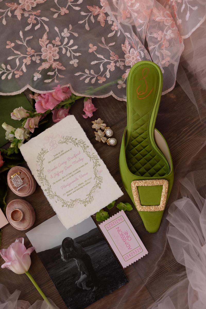 Photography: Emily Hendrick Photography; Planning, design and stationery: Brookeโs Brides; Videography: Iron Wood Media (Jack Hoyle); Second florist: Darling Blooms; Drink service: Bohemian Geeks; Jeweler: Underwoodโs Fine Jewelry and Jones & Son; Ceremony music: Northwest Arkansas Symphony Orchestra; Catering: GS Meaty Buns; Linens: Love Linens Rentals; DJ: Mega DJ Co.; Rentals: Alchemy Event Rentals; Dance floor: A Team Party Rentals; Custom guest portraits: Nicole Renee Fine Art; HMUA: Dazzle with Brazil; Transportation: Pinnacle Transportation; Content creation: Love That Social; Reception jumpsuit: Nadine Merabi