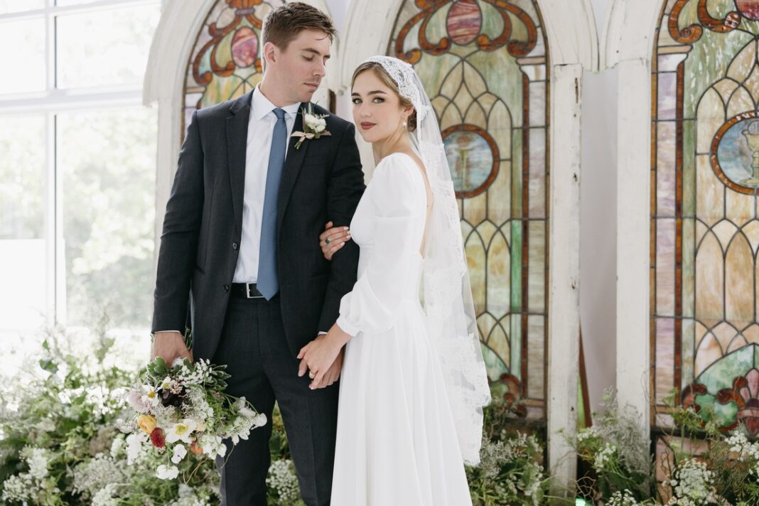 A: “I have a love for the beautiful architecture of cathedrals and the way that imagery, art and colors are used to tell the story of Jesus and his beauty,” Laura Leigh said. “I knew from the beginning that I wanted to incorporate stained glass in our wedding…The bridesmaids’ dresses were chosen to represent the vibrant jewel tones you often see in stained glass.”