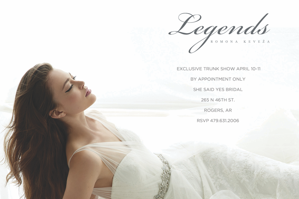 If you’re still looking for THE dress, our friends at She Said Yes Bridal in Rogers are hosting an exclusive Legends by Romona Keveza trunk show and it’s going to be to die for.
