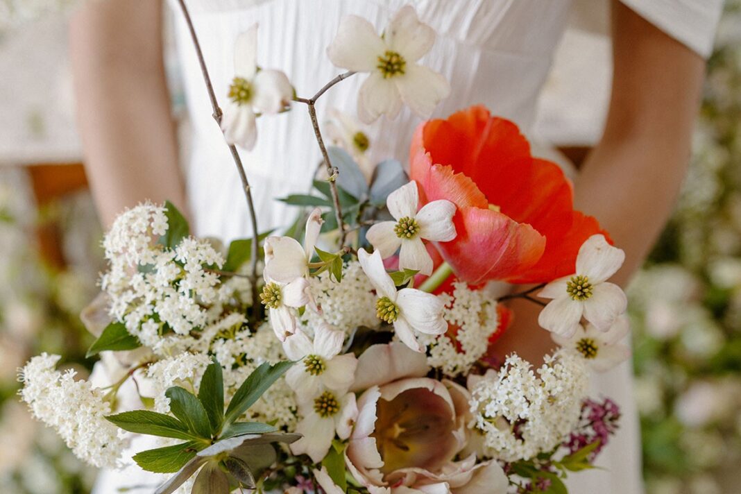 Florals, design and styling: Fleurish Floral Studio; Wedding dress and earrings: Joon Bridal; Venue: The Grand at Willow Springs; Model: Laney Kellybrew of AVA Model Management; HMUA: Boun Vang;Â Photography:Â Alyssa Simpson Photos
